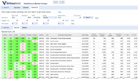 While a resulting transaction might not be a perfect match with the subject, it may match on several of the attributes. It evaluates multiple attributes to find and score comparable transactions. It provides a data-driven analysis, rather than a qualitive “eyeball” analysis of the data. Instead of filtering on one or two criteria, MARS simultaneously assesses five attributes (industry, revenue, date, location, and business description).